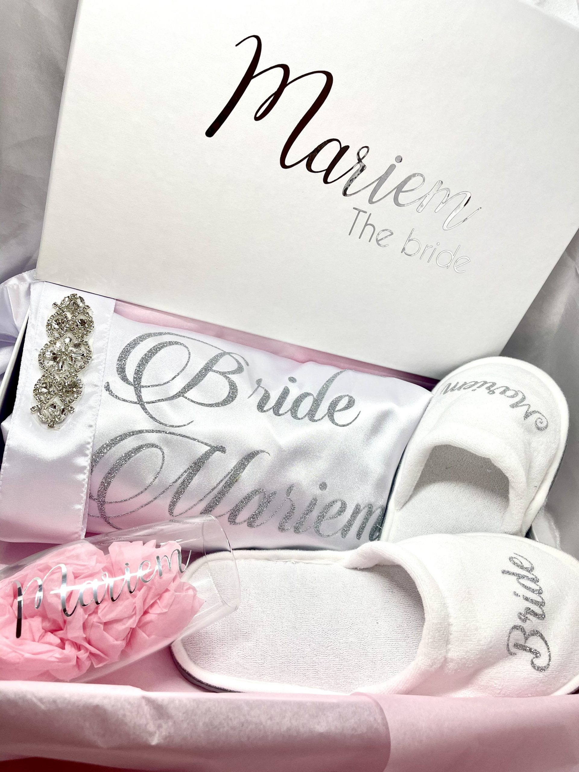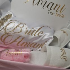 - Boîte mémorable : Tous ces trésors sont présentés dans une superbe boîte personnalisée, portant l’inscription « Prénom The Bride ». Cette boîte devient un souvenir précieux de votre jour spécial, quelque chose que vous pourrez chérir longtemps après la cérémonie.