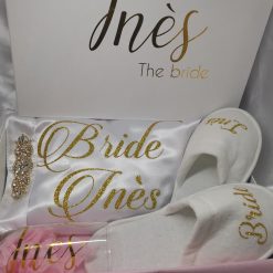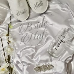 - Peignoir avec Strass : Le point central de la box, un peignoir en satin d’une élégance éblouissante. Personnalisé avec « Bride [Prénom] » dans le dos, ce peignoir ajoute une touche de glamour à chaque moment de la préparation.